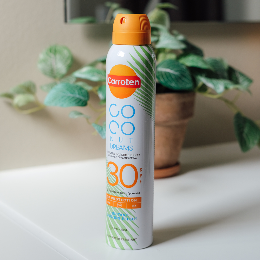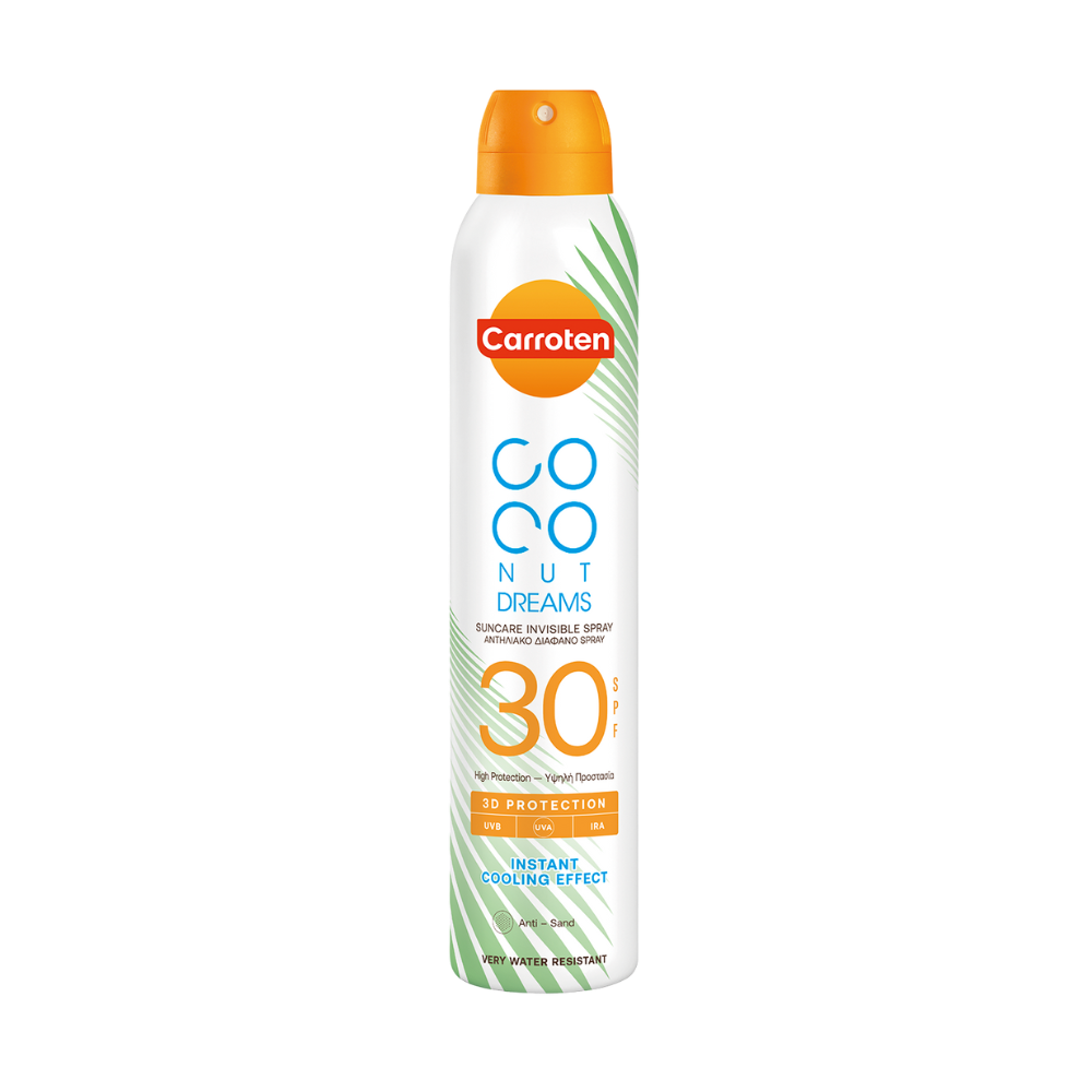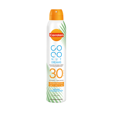 Coconut Dreams Dry Mist SPF30 tilbyder høj solbeskyttelse med 360° spraysystem til nem og hurtig påføring på huden fra alle vinkler.
