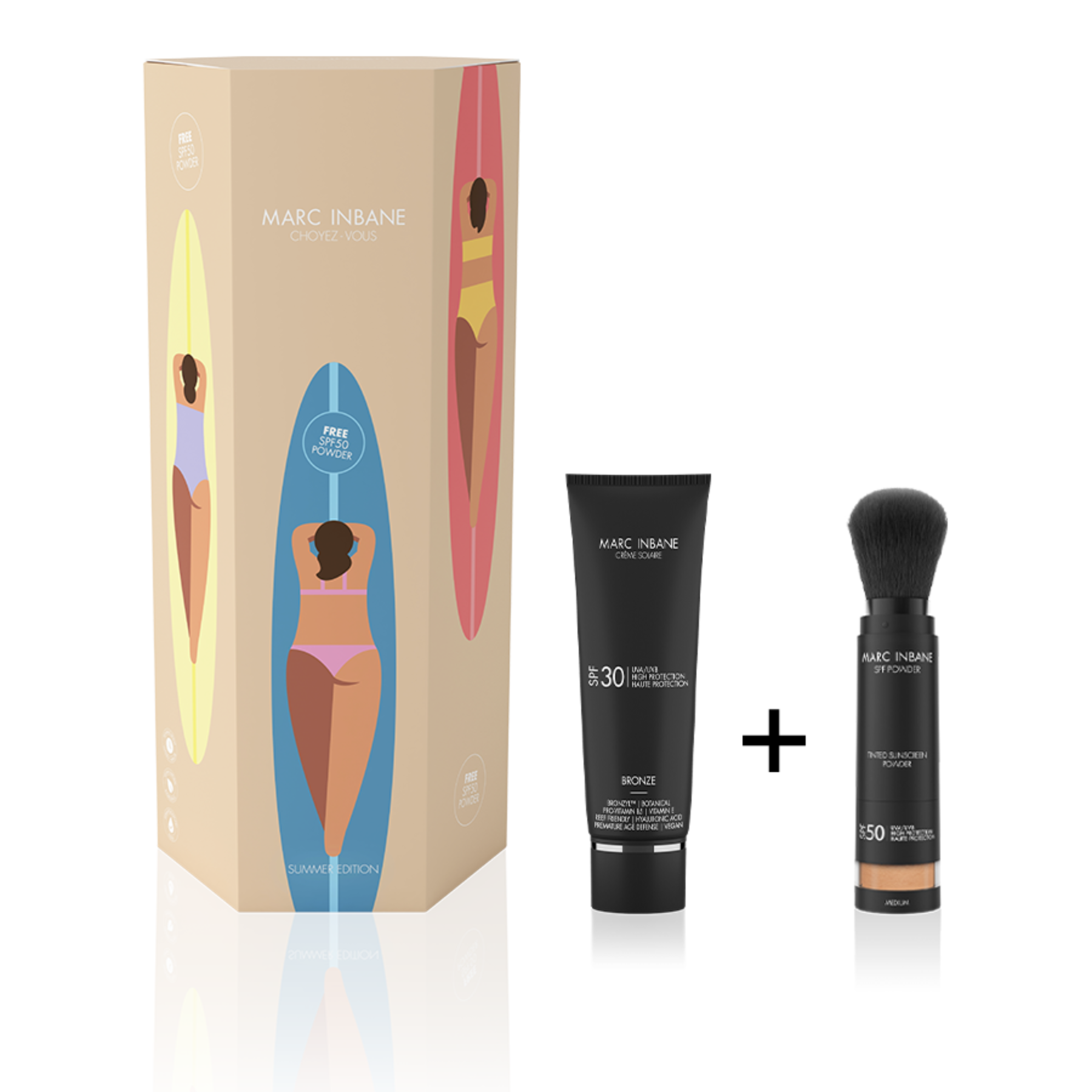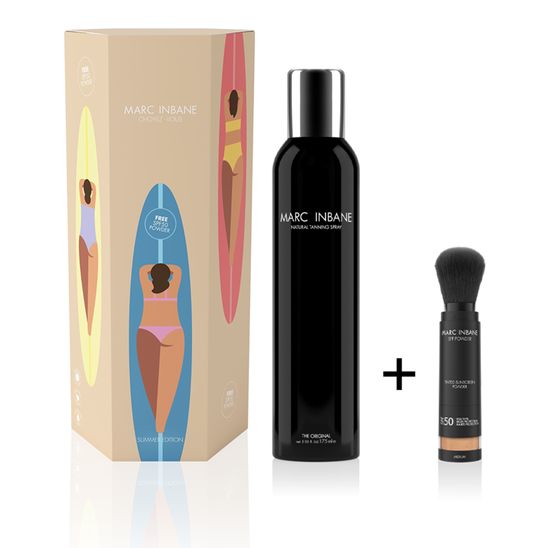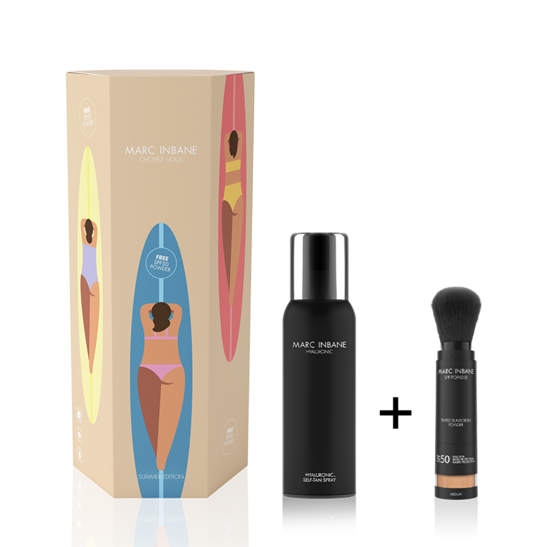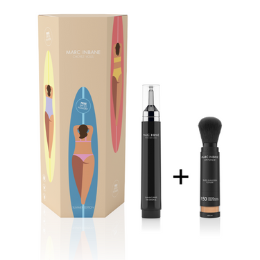 Som en ekstra gave medfølger Marc Inbane Powder Brush SPF 50, en praktisk mineralpudder med høj solbeskyttelse, der beskytter huden mod solen i løbet af dagen uden at påvirke din glød.